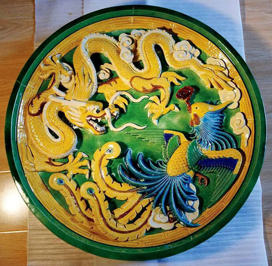 琉璃制品中,常常會有用于影壁等處的大型裝飾構(gòu)件。這張龍鳳大盤工藝精致,用色多達(dá)七種,有龍身的黃、背景的綠、靈芝的紫、祥云的白、鳳翅羽的藍(lán)、鳳頸的孔雀藍(lán)、鳳眼的黑。最奇妙的是,施釉前的顏色(上圖)與燒成的顏色(下圖)完全不同,讓人對傳統(tǒng)工藝的神奇變化油然而生敬佩之心。